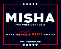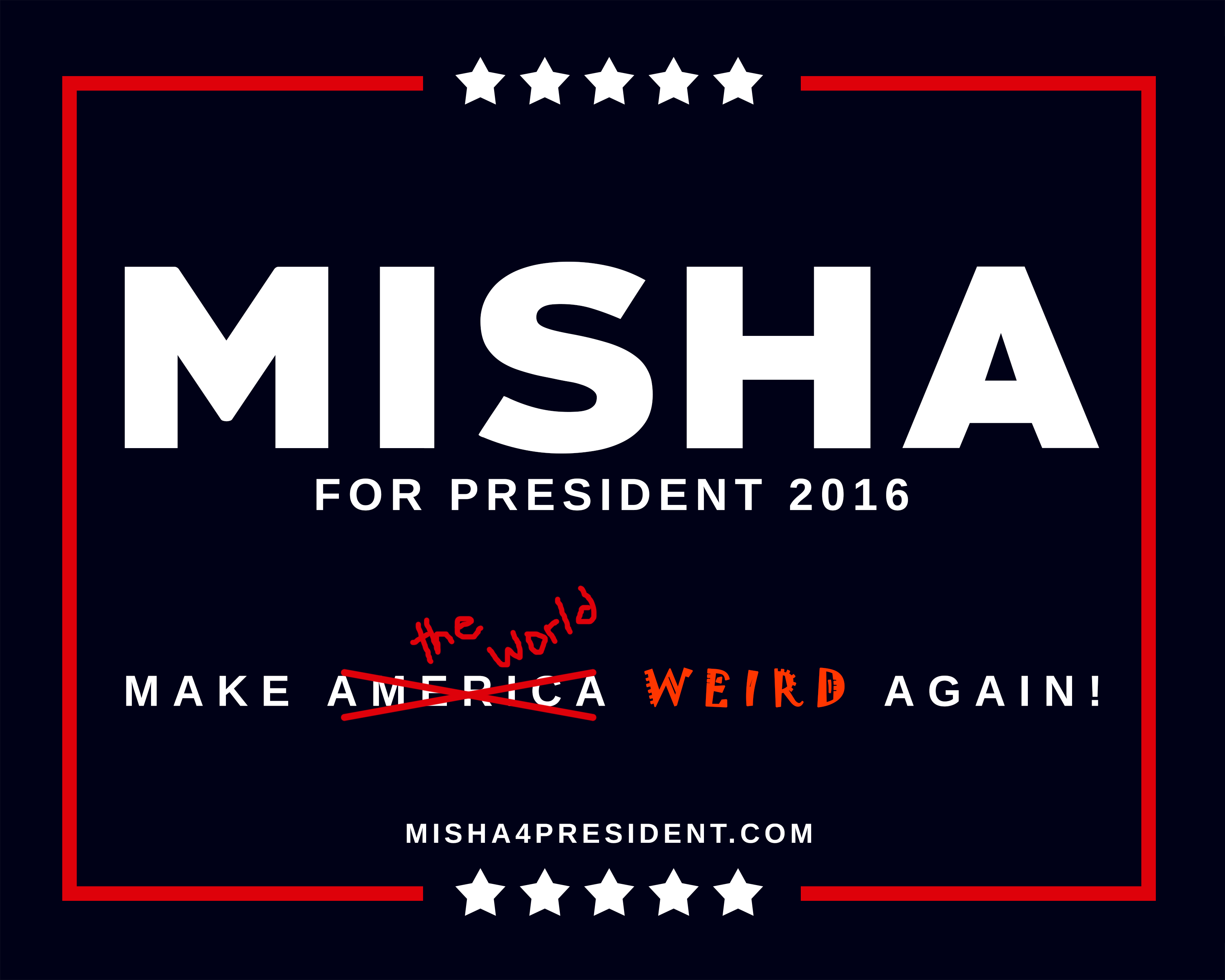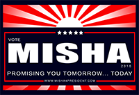 Why Misha? Why?We know what you're thinking, because we thought it, too. Frankly, people ask this question all the time. But when you really stop to think about it, the answer is clear. Why NOT?Vote for Misha Collins because you can. Nobody can tell you how to cast your ballot! You have the freedom to choose, so why not choose to elect the obvious best man for the job? But I Always Vote Along Party Lines...Vote Misha! Misha Collins is the only candidate with the balls to run as a bipartisan candidate, throwing his hat into the ring as both a Democrat and a Republican. But future Commander-in-Chief Misha Collins isn't content with just being "bipartisan." He's also the world's first "try-partisan" candidate— meaning there's almost no party he won't try to get into bed with to win the Presidency*. In addition to Democrat and Republican, Misha is also running as an Independent, a Green Party candidate, a Peace & Freedom party candidate, and a Libertarian. In fact, Future President Collins is committed to being involved in as many parties as possible, as long as they're not being held at his house so he doesn't have to clean up the mess. *Seriously. Got pull with the Electoral College? For a good time, call (323) 790-4967. A Candidate Without Limits.Misha Collins is a candidate that doesn't believe in limits and is willing to do pretty much anything in his desperate grab for power. But no one ever rises to the level of "serious presidential contender" without engaging in a little blatant hypocrisy. With that in mind, Misha Collins is not running as a candidate for the Prohibition party, The American Freedom party, or any party that doesn't have at least one piñata or a pony— because nobody needs that kind of negativity in their life. As your new global leader, you can count on President Collins to always bring the party— no matter which party you support. After all, if you're going to cast a ballot for a megalomaniacal narcissist anyway, why not choose the one that will make the next four years fun? Your Vote Counts... So make a Difference.Gum up the works this election year! Vote for real change. Vote for a true abberation. Vote for Misha Collins for President!* Then, make a donation to help support the campaign team's corporate jet and fancy lunches.** *Of the United States... Or just embrace the inevitable and elect him President of the Universe. Show your Support!Proudly display your support with these printable campaign signs!